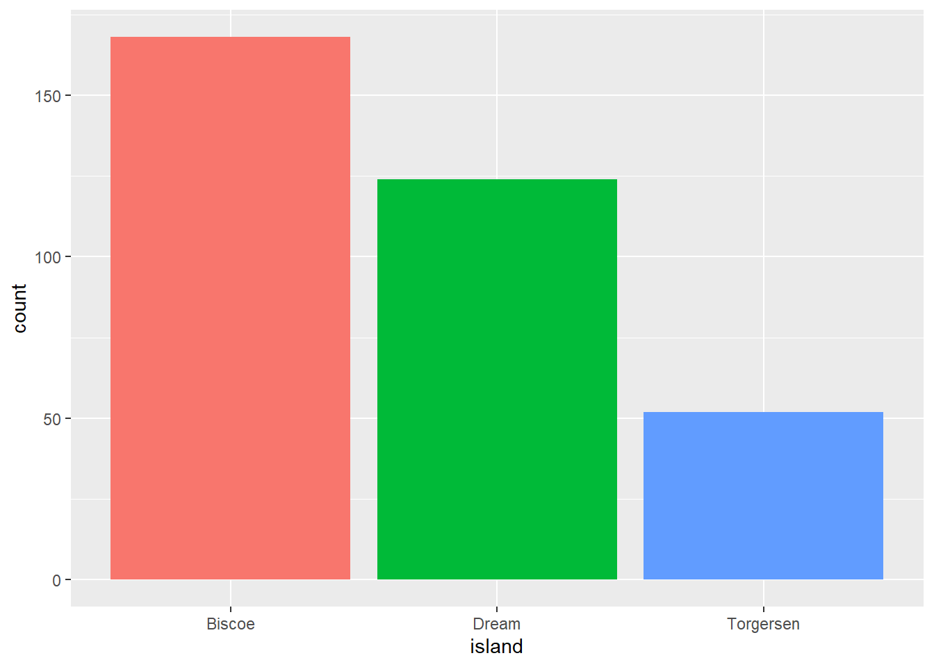 ggplot(pen, aes(x=island, fill = island)) + geom_bar() +