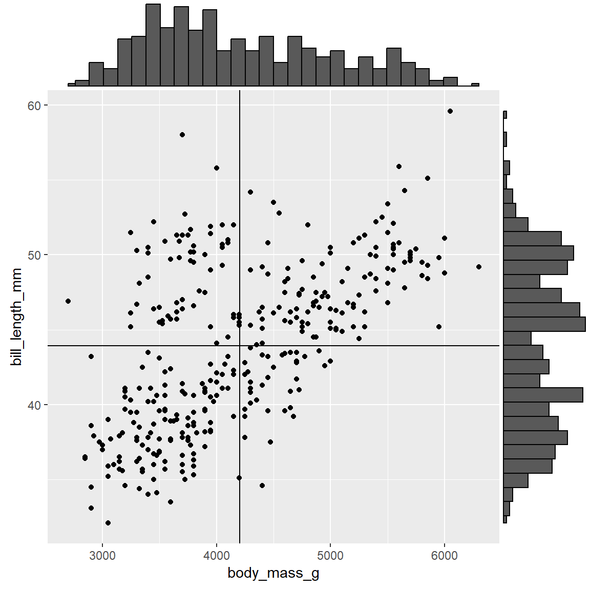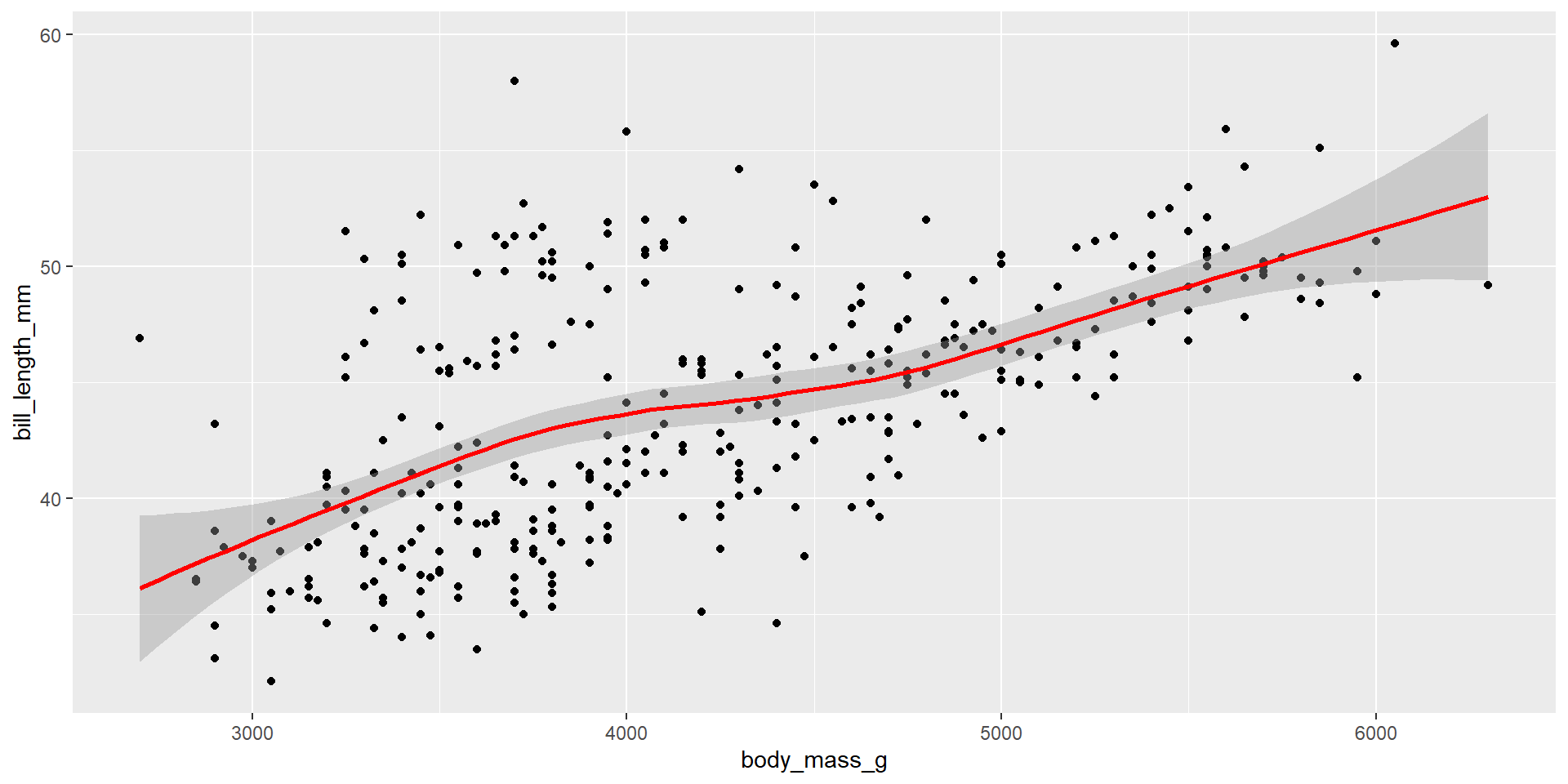 There is a strong, positive, mostly linear relationship between the body mass (g) of penguins and their bill length (mm) (r=.595).