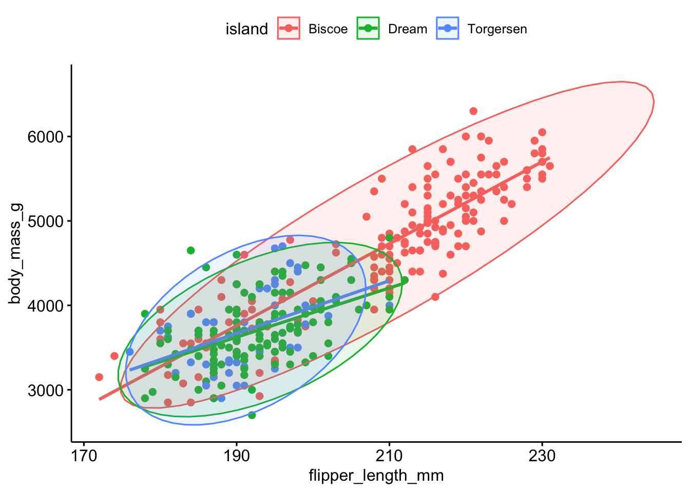 ggscatter(pen, x="flipper_length_mm", y ="body_mass_g", add ="reg.line", color ="island", ellipse =TRUE)