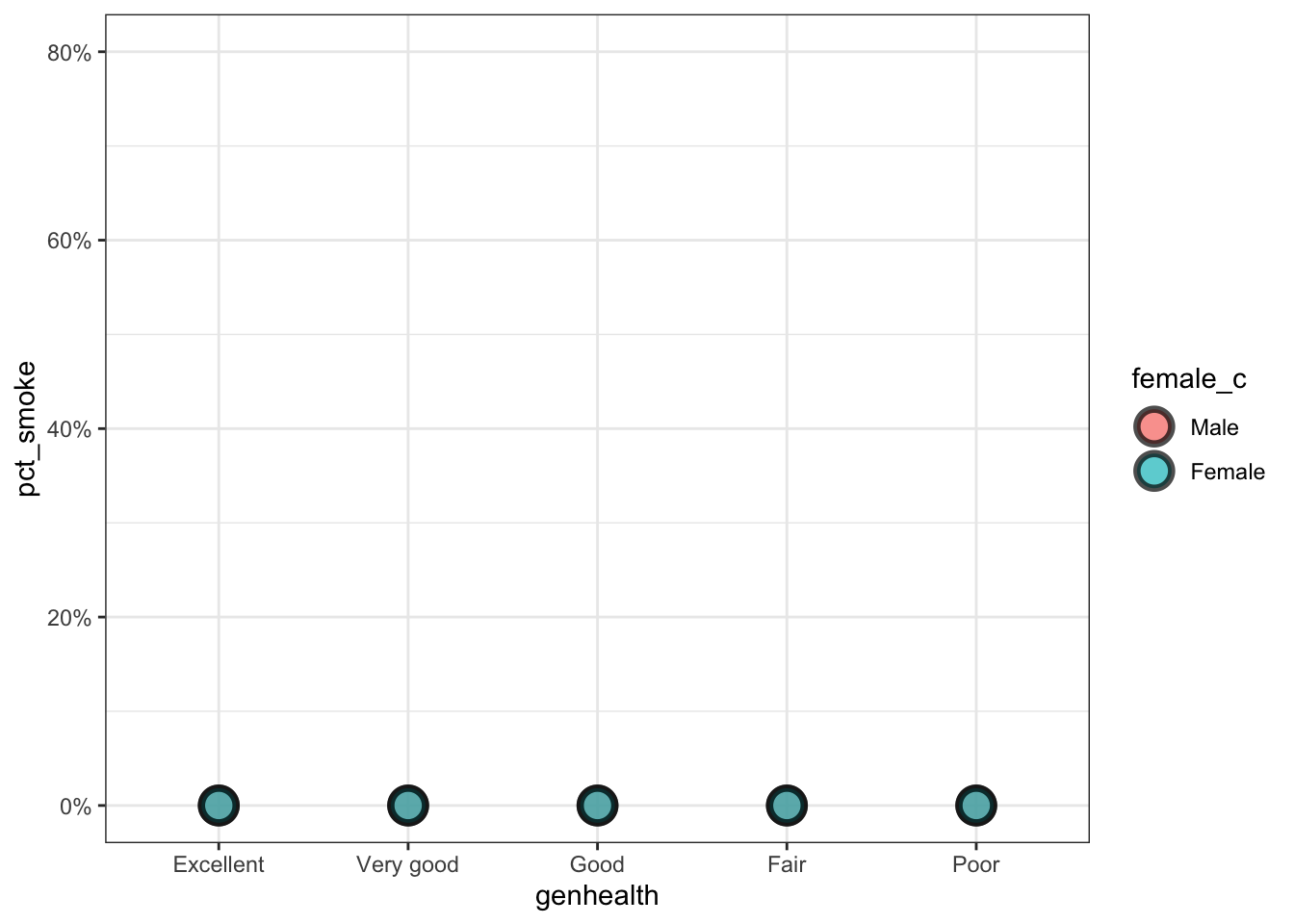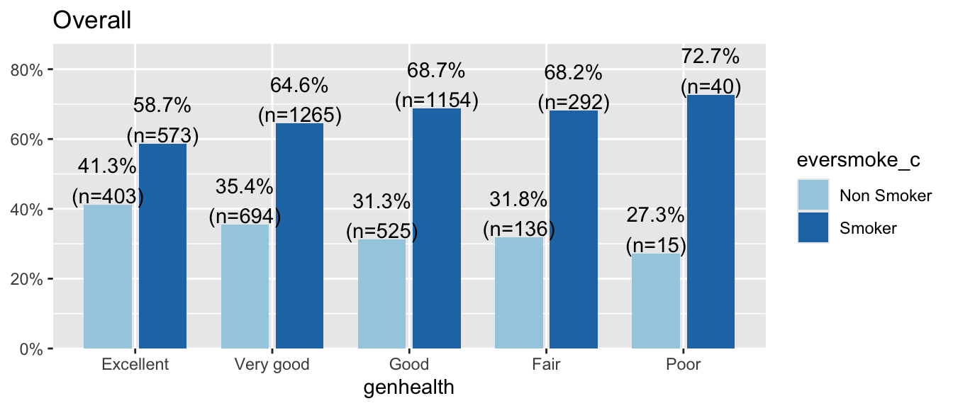 The relationship between smoking status and general health is significant in both the main effects and the stratified model. The distribution of smoking status across general health categories does not differ between females and males. Gender is not a moderator for this analysis.